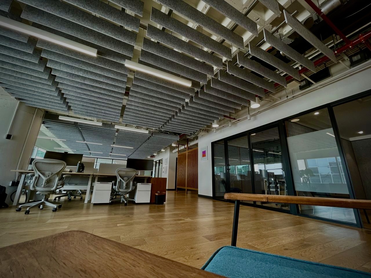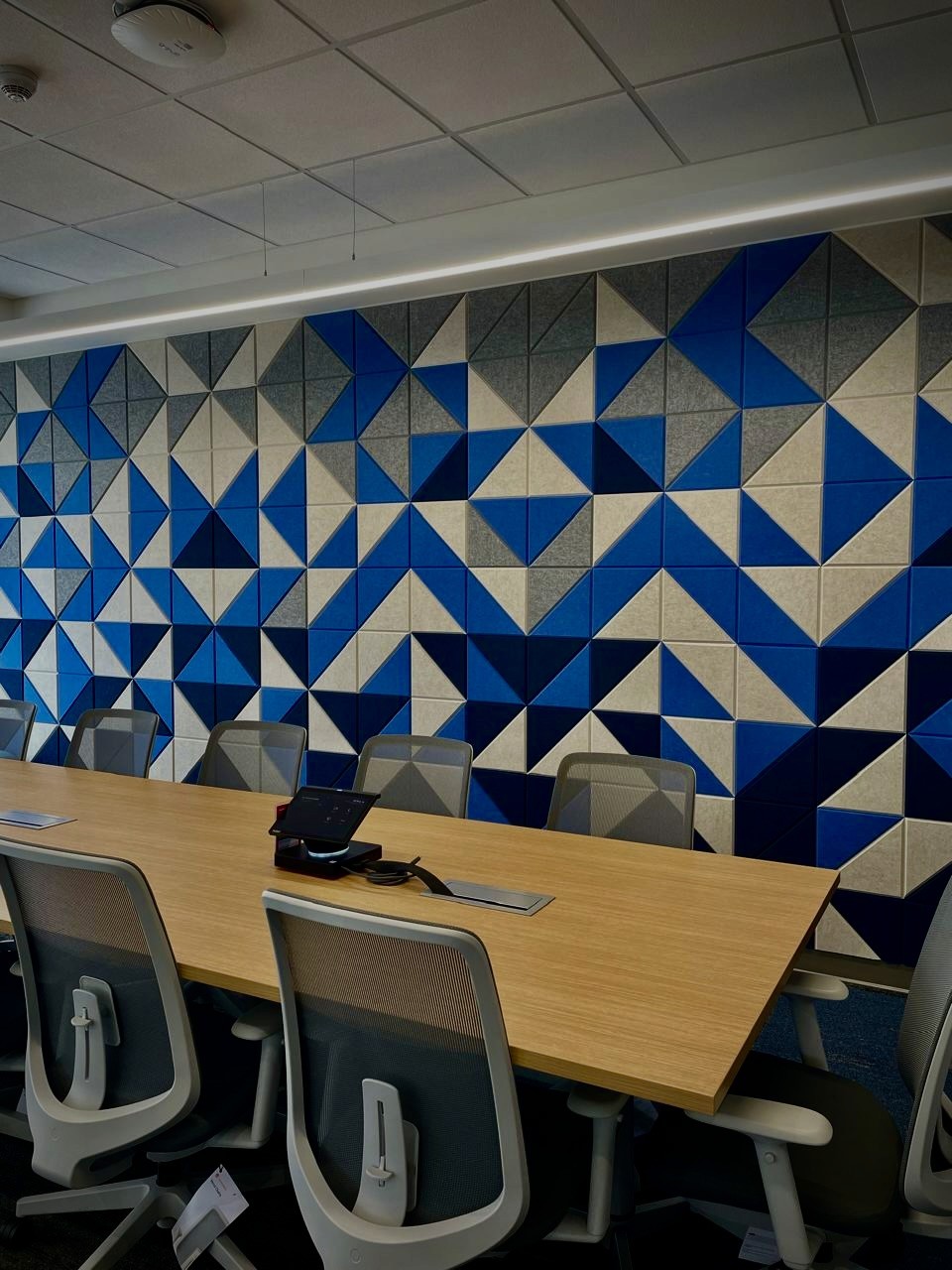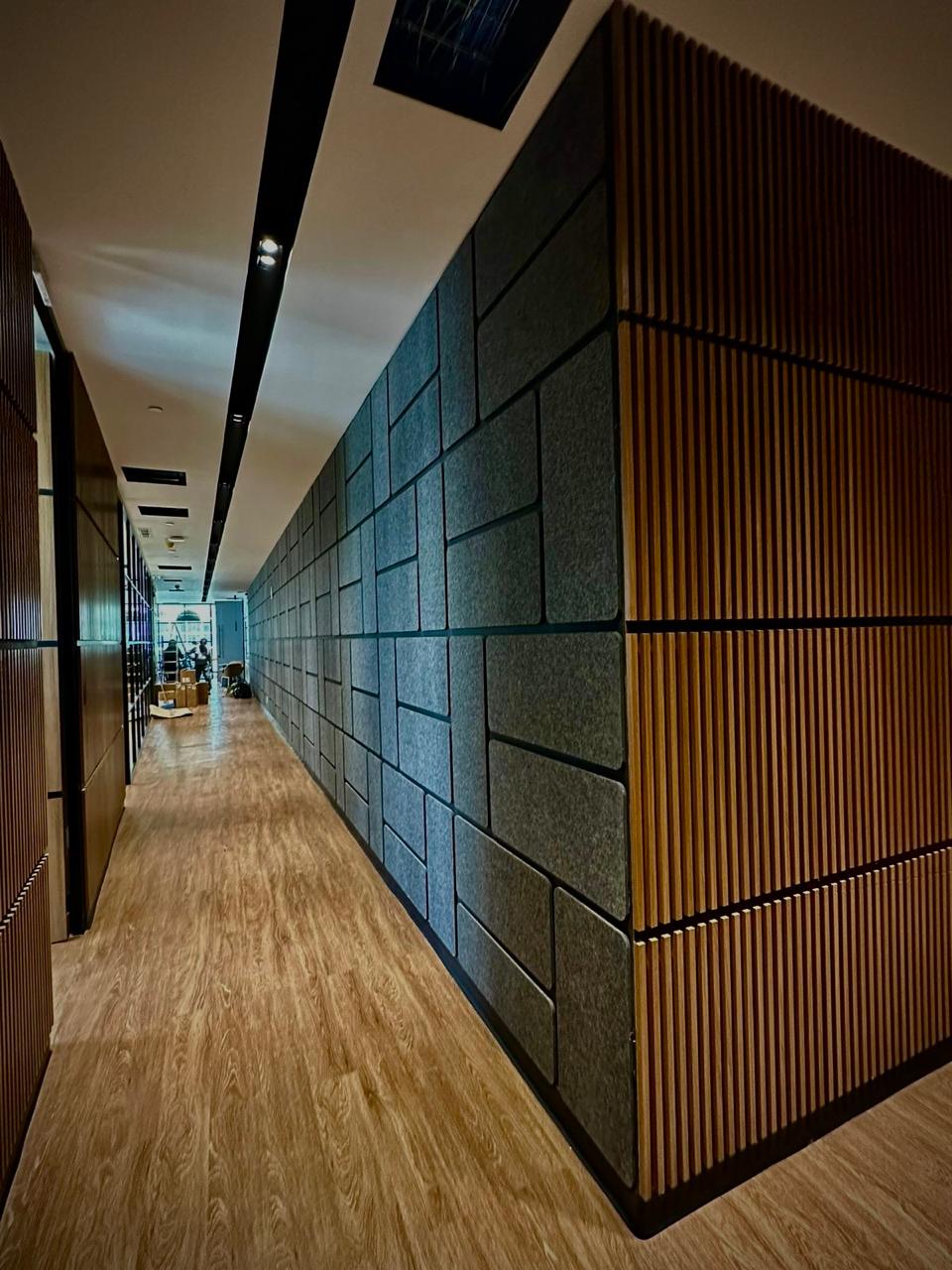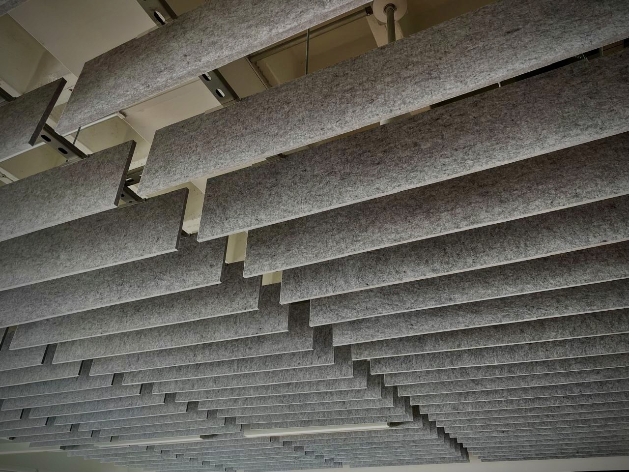 Plafones, baffles, muros y nubes acústicas instalados con precisión técnica.