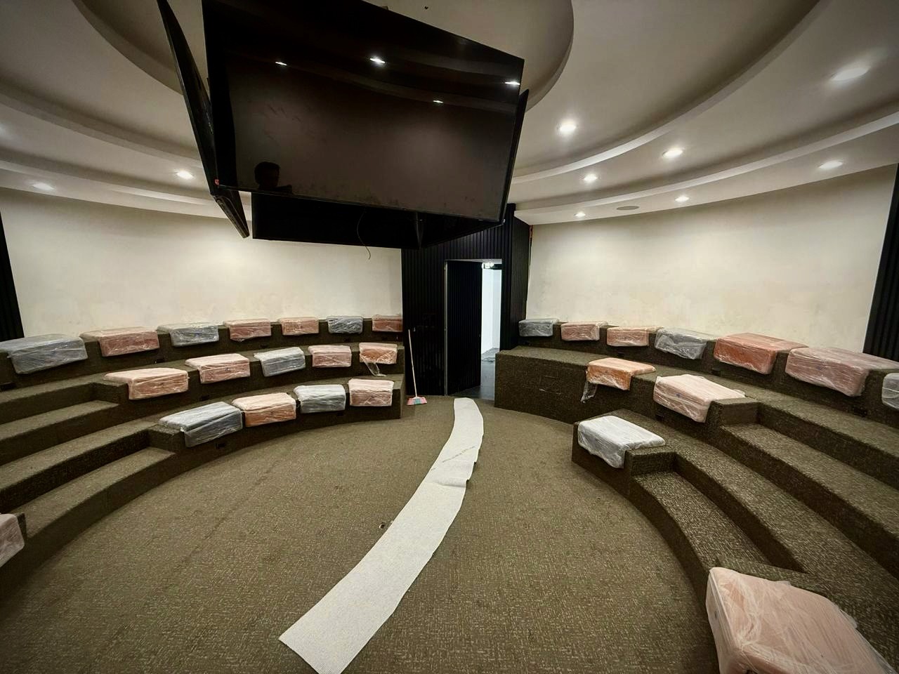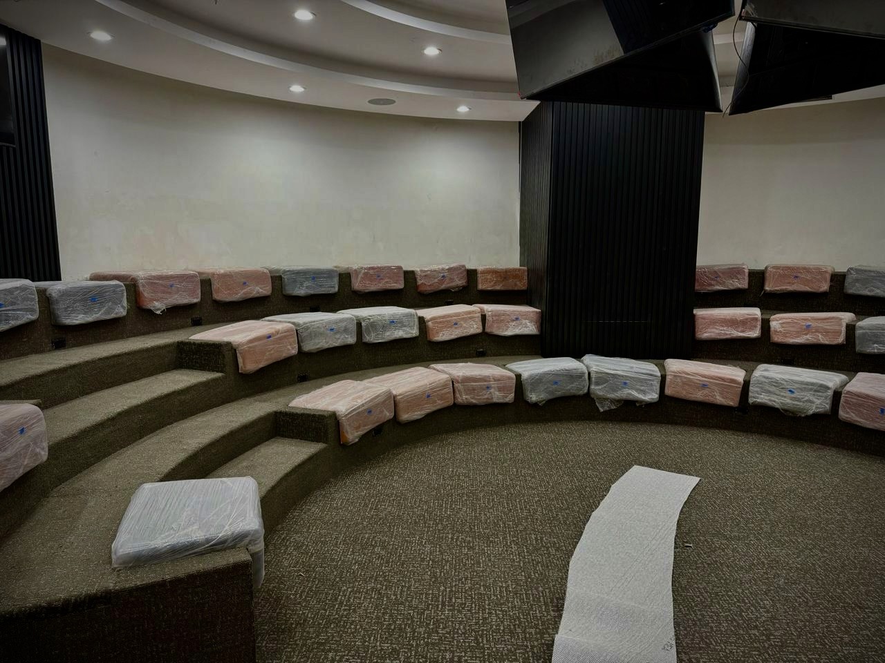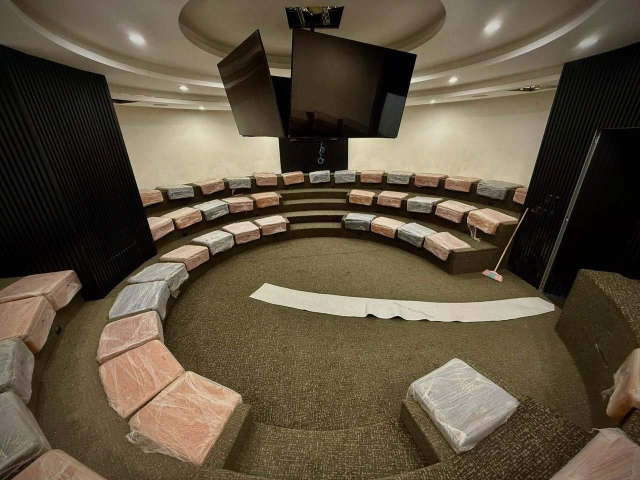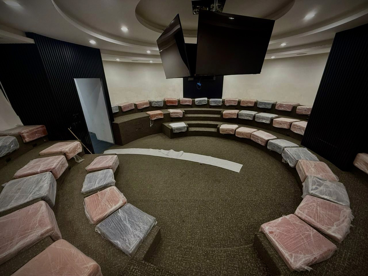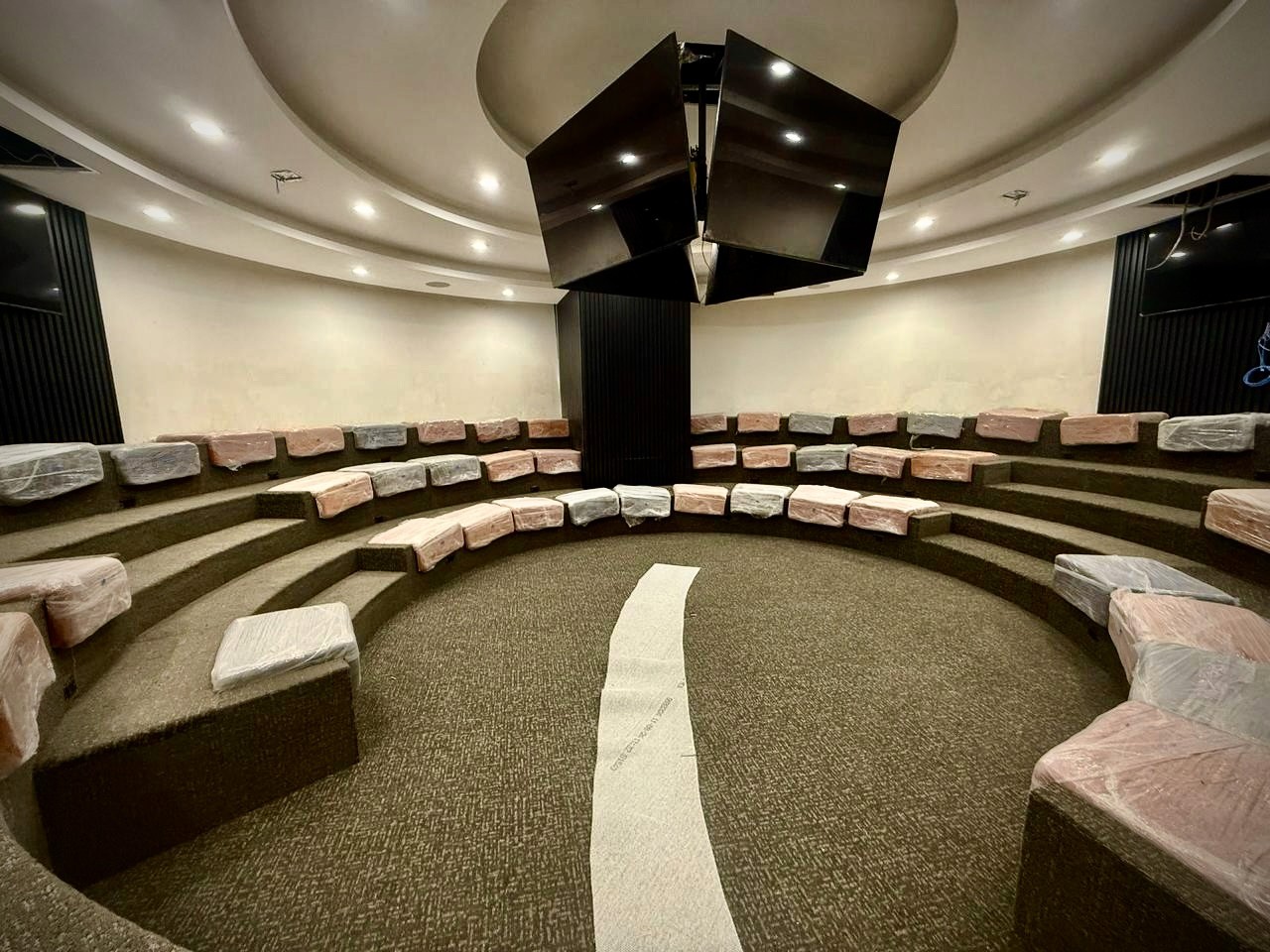 Plafones, baffles, muros y nubes acústicas instalados con precisión técnica.